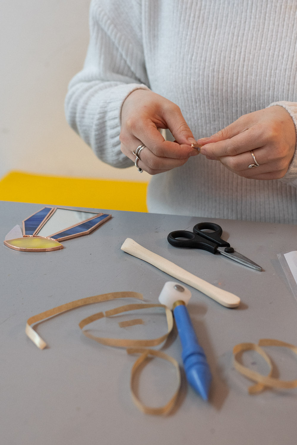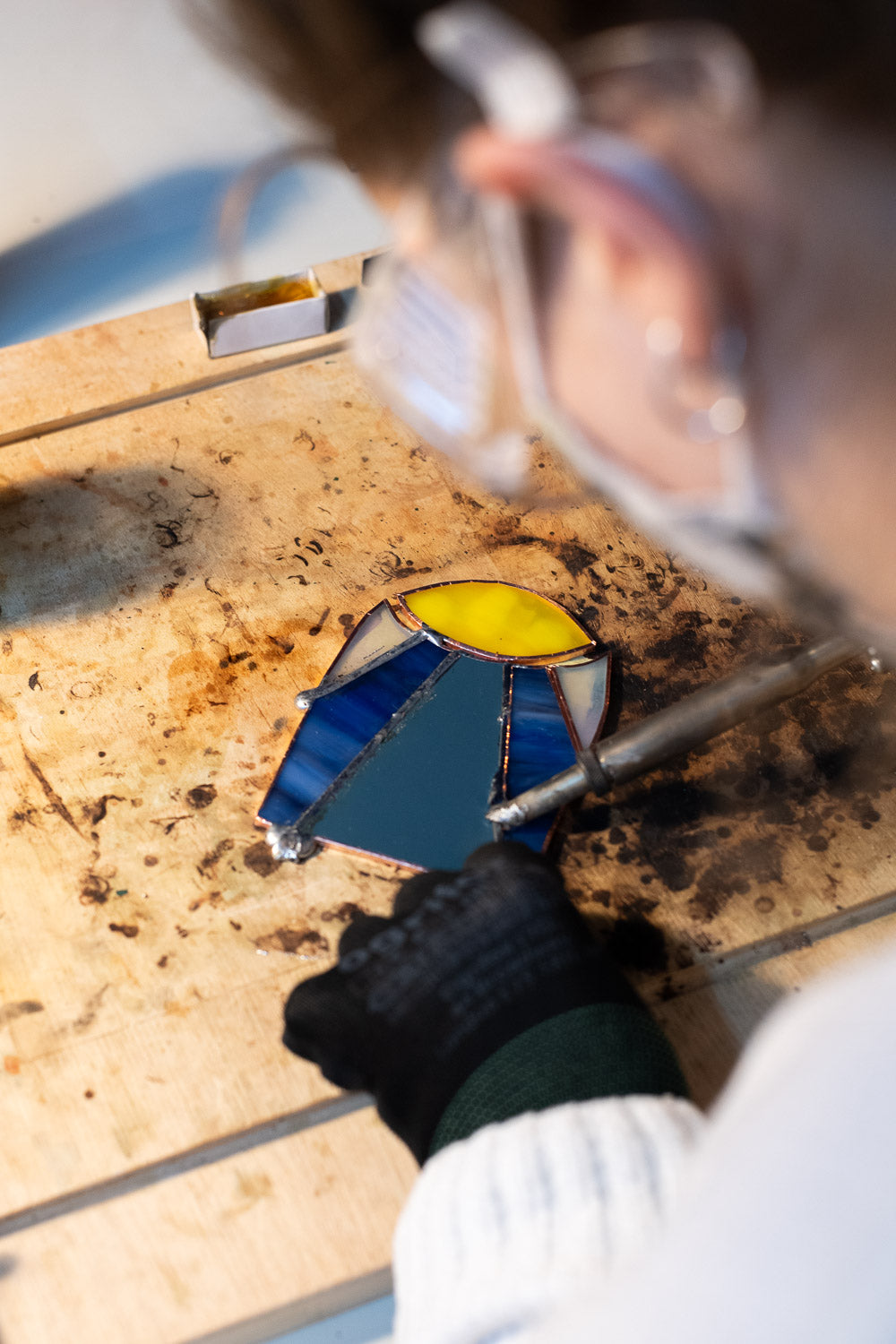 Last but not least, it’s time for soldering! During this step, you’ll merge the copper-foiled glass pieces together using solder. Your stained glass creation will transform from separate parts into one piece of art during the last step of the workshop!